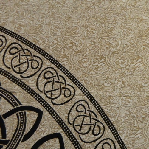 Farbgestaltung: Detaillierter, creme-farbener Hintergrund mit zentralem, keltischen Mandala-Motiv in Schwarz.