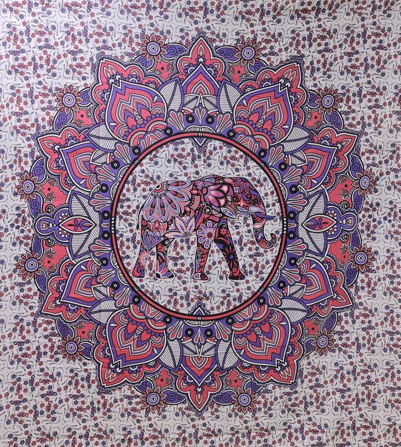 Farbgestaltung: Weißer Grund mit pink-lila Elefanten im Lotuskreis.